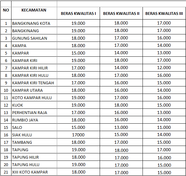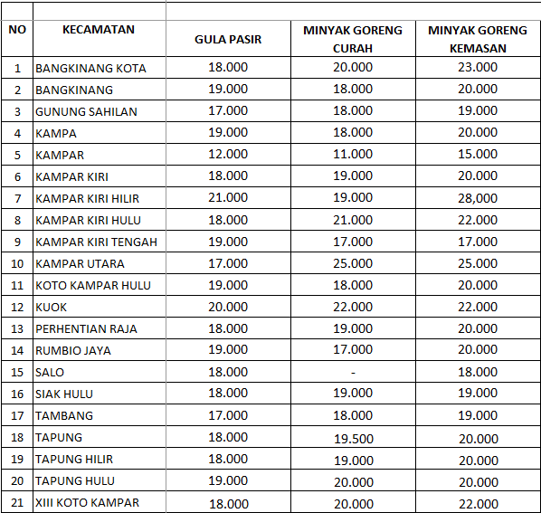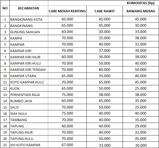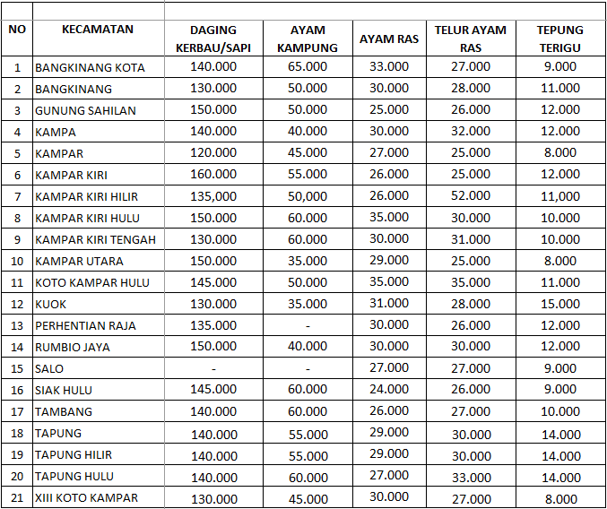 Rekapitulasi Harga Bahan Pokok Kabupaten Kampar Bulan Desember Tahun 2025 Admin 09 Januari 2026 WIB 41 Kali REKAPITULASI HARGA BAHAN POKOK DI PASAR KECAMATAN KABUPATEN KAMPAR BULAN DESEMBER TAHUN 2025